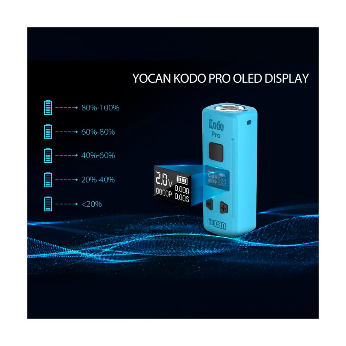 El Yocan Kodo Pro se destaca por su portabilidad sin comprometer rendimiento. Gracias a su tamaño ultra compacto, cabe fácilmente en cualquier bolsillo o estuche. Su pantalla OLED te permite visualizar el nivel de voltaje seleccionado (de 1.8V a 4.2V) y el nivel de batería, lo que te brinda un control total sobre tu sesión.