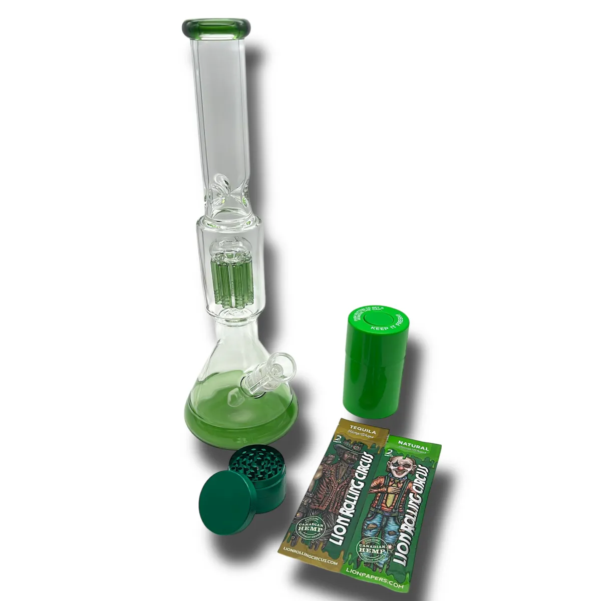 - Todo este set bong inlcluye: 1 bong verde con percolador de 35cm, 1 grinder aleacion de zinc 50mm, 1 contenedor para flores y 2 blunts de LRC.